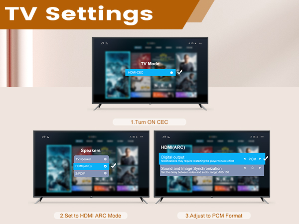 Prior to use, ensure the ARC feature is enabled and HDMI ARC is set as the audio output device in your TV setting menu.